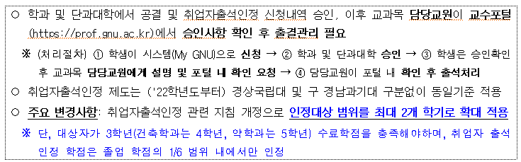 1. 관련:「경상국립대학교 학사관리 규정」제72조 및 제74조,「구 경남과학기술대학교 학사운영 규정」제74조 및 제76조,「경상국립대학교 취업자 출석 및 학점인정 운영에 관한 지침」