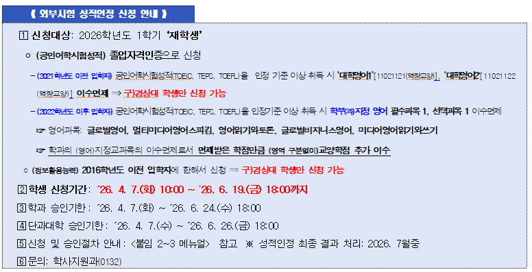 2. 2026학년도 1학기 외부시험(공인어학시험, 정보활용능력) 성적인정을 아래와 같이 실시하오니, 학과에서는 학생이 신청할 수 있도록 안내하여 주시기 바랍니다.