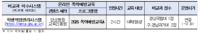 ※ 향후 개설 예정 콘텐츠[2026 서울대 제작 콘텐츠(폭력예방교육B, Violence Awareness Education, 暴力预防教育), 찾아가는 폭력예방교육 등]와 중복 이수 시 비교과 점수는 1개만 인정